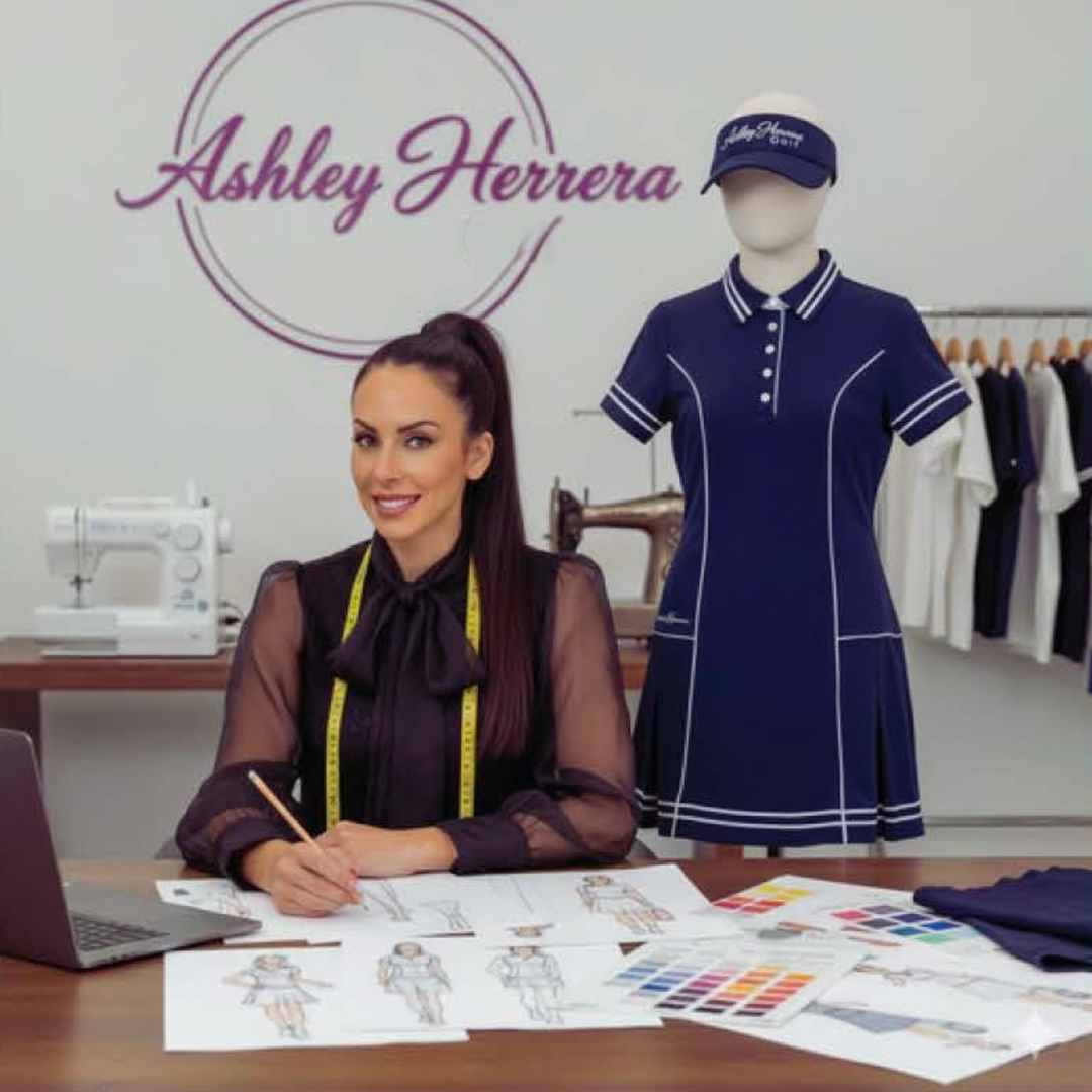 Ashley’s expertise spans couture design, luxury footwear, and premium active apparel. Her namesake label embodies sophistication and versatility — merging high fashion with functionality for women who embrace sport, travel, and style with confidence.